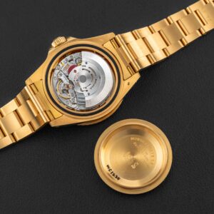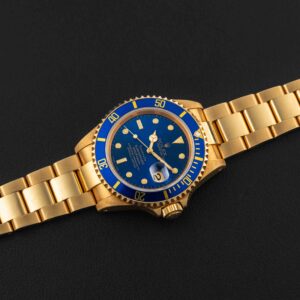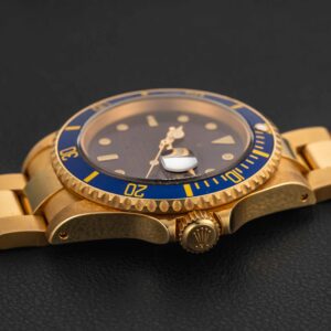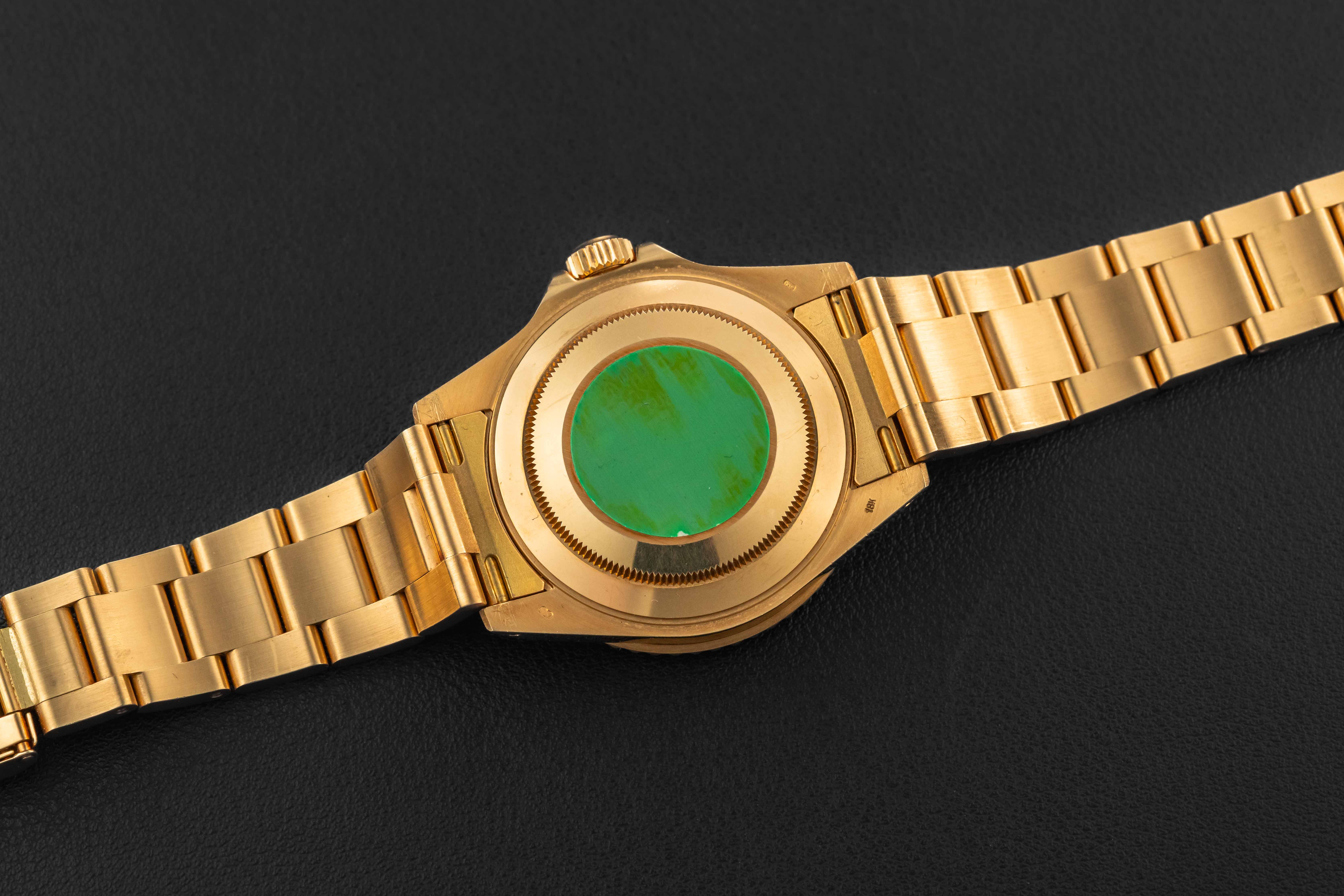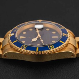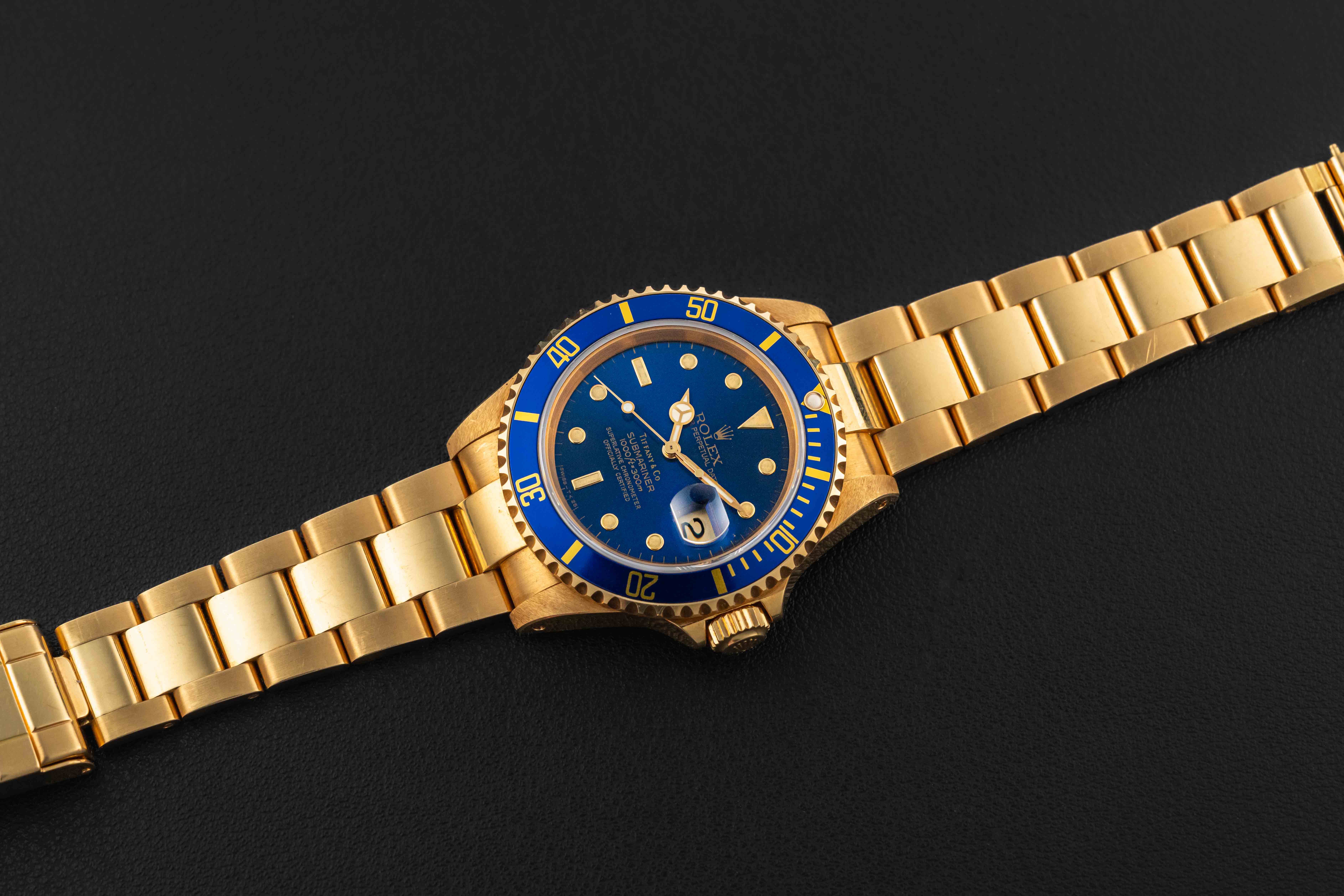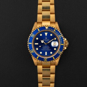 Offered here is a beautiful example of a Rolex Submariner, in solid 18kt yellow gold, circa 1989, bearing the reference 16618. However, what sets this example apart from the rest is the fact that it was retailed by Tiffany & Co. This Rolex Submariner is in excellent vintage condition, extremely sharp and well-preserved. The case does not appear to have been polished in the past (albeit worn from use), with sharp and even lugs, beveled edges still visible, and its original caseback sticker still visible on the back. The dial and lume are perfect, with no wear or damage, and aged to a lovely yellow color. The watch retains its original solid gold Rolex Oyster flip-lock bracelet with 11 full links and minimal stretch.