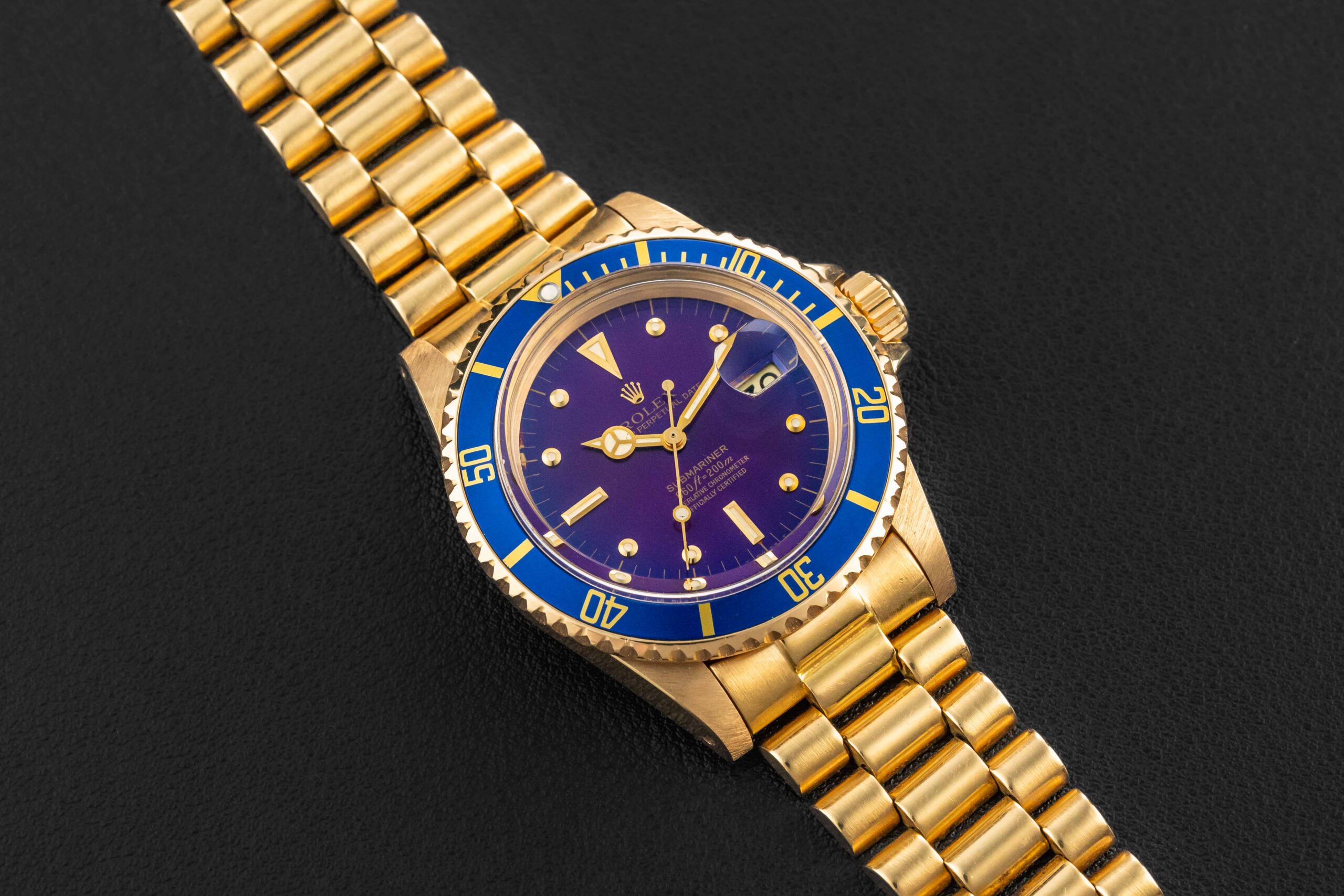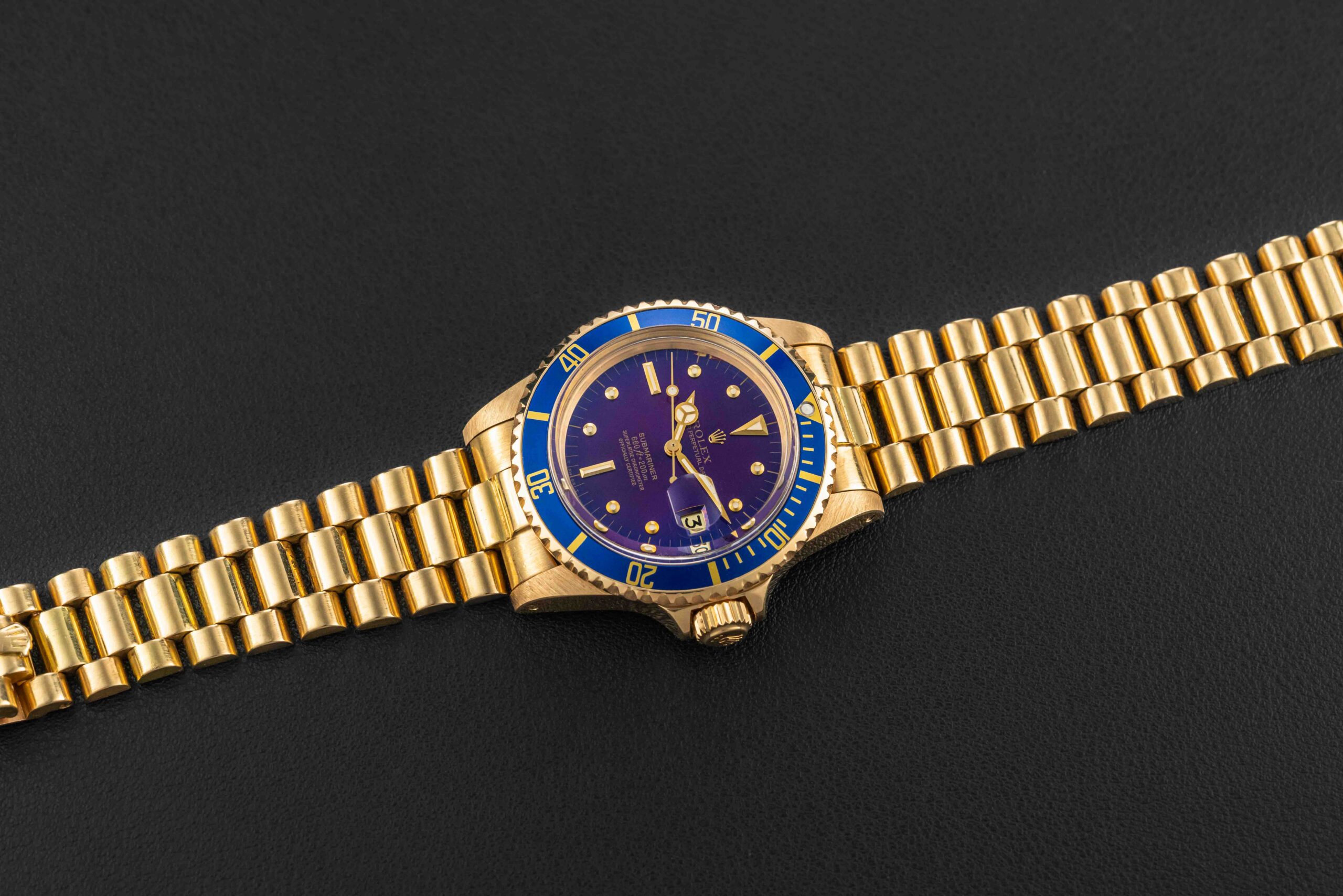 Offered here is an absolutely stunning Rolex Submariner, reference 1680/8, in 18kt yellow gold, circa 1978. This particular Submariner was fit with a factory blue dial and matching blue bezel insert; the original blue dial has aged to a striking purple, due to a defect in the lacquer used by Rolex during this era. The condition of this special Rolex Submariner is lovely. The case has been previously polished, but retains thick and even lugs, with nicely beveled lugs. The dial shows no damage or wear and has aged to a lovely purple color throughout. Additionally, the original tritium lume is present on both dial and hands, aged to a lovely cream color. Finally, the watch comes on a Swiss Rolex Presidential bracelet, fitting an approximate 7-7.2″ wrist, with light stretch; this watch originated out of South America, where many gold sports model Rolex were found with Presidential bracelets (or South American bracelets), as the ADs during this time traditionally used what was available to them due to changing import restrictions on precious metals.
