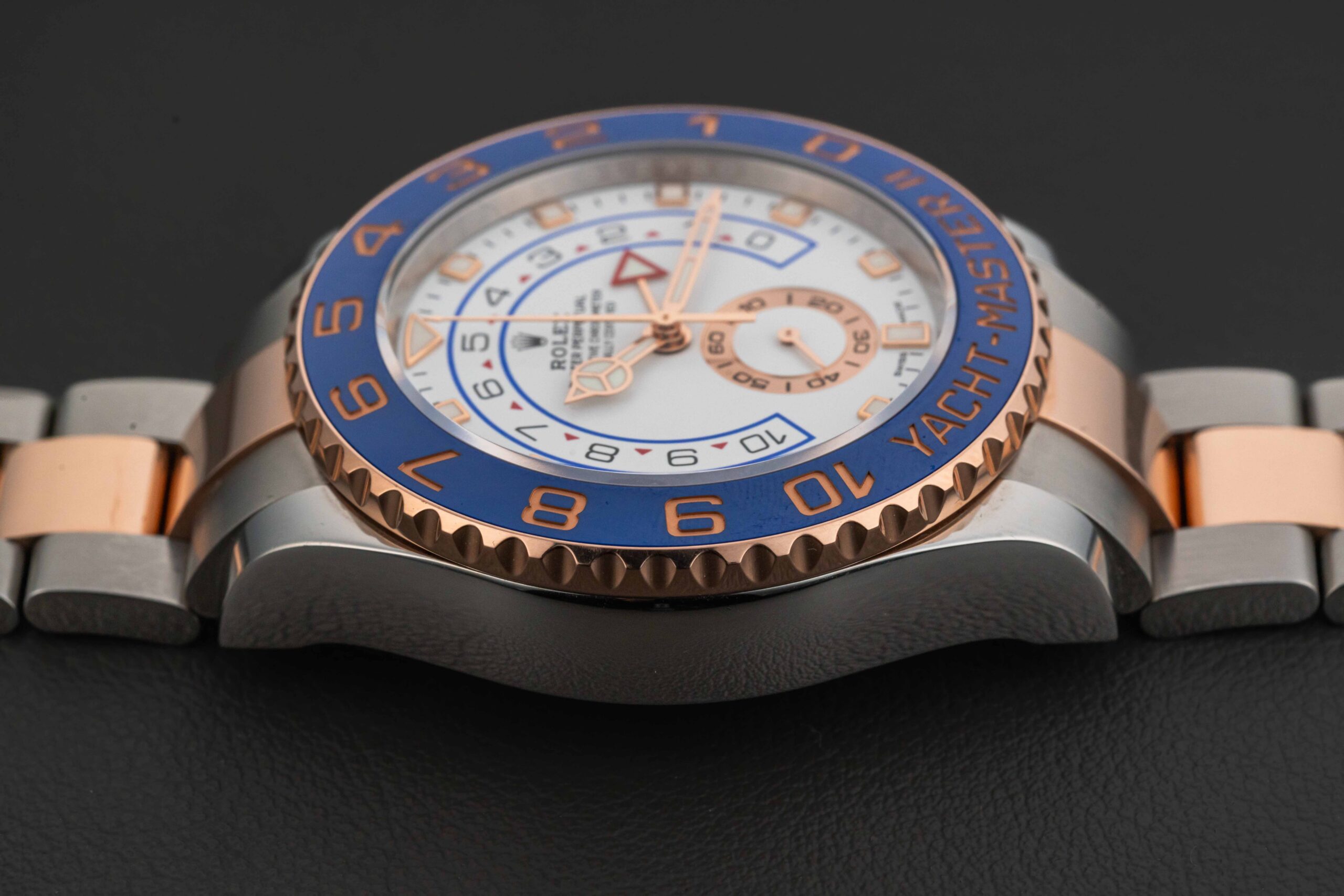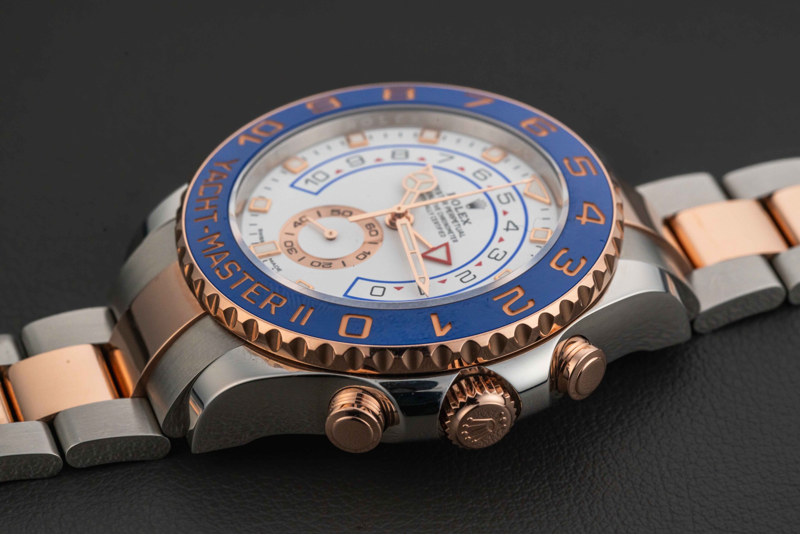 Up for grabs is a Rolex Yachtmaster II, made in 18kt rose gold and stainless steel, reference 116681. This particular example comes with its original Rolex box. The Rolex Yachtmaster II itself is in very good pre-owned condition, showing virtually no wear, having been recently detailed. Further, the watch has 11 full links.