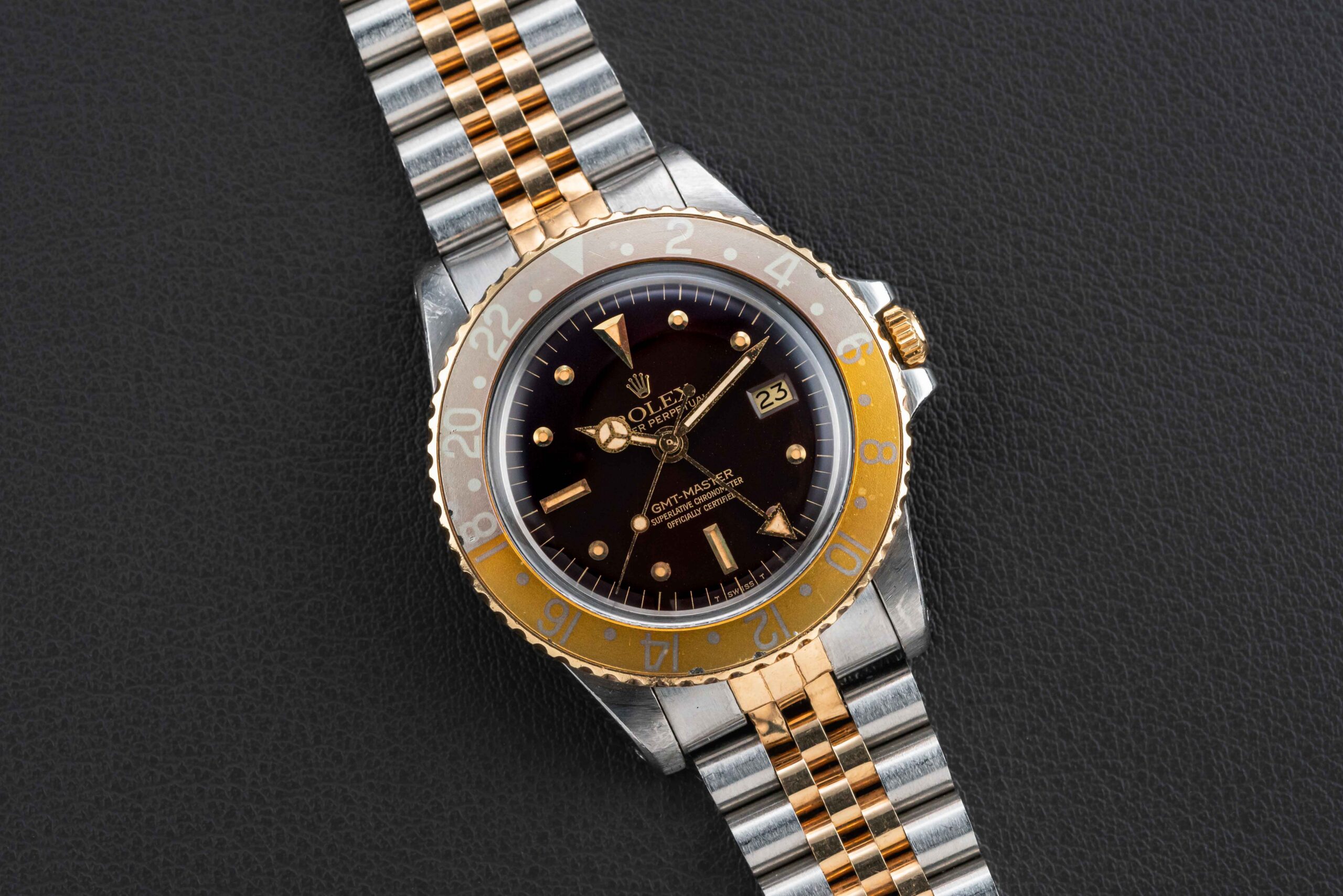 Up for grabs is a lovely example of the popular “Root Beer” Rolex GMT-Master, reference 1675, in two-tone steel and yellow gold, circa 1978. This example features the so-called “nipple” dial, due to the smaller hour markers, with an iridescent sunburst finish.