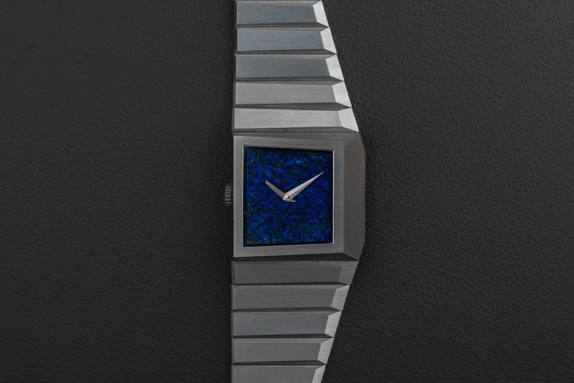 Up for grabs is the highly anticipated and beloved initial release from independent duo, Toledano & Chan. The mastermind behind this brand, Mr. Phillip Toledano, is a highly respected artist in the digital space (photography), and dreamed of designing a “brutalist” watch, inspired by his favorite models of the 1970s, in addition to some of his favorite architecture from New York City. On a chance encounter, Phillip met his partner, Alfred Chan, and their creative juices began flowing immediately. After several years of hard work, tenacity, and true grit, the B1 was born, featuring a titanium case with integrated bracelet, and lapis lazuli stone dial. The watches were produced in a limited run of 175 pieces, and sold out immediately. The current watch offered here is in like new condition, complete with its original matching box and papers, and is numbered 88 (for good luck!) of 175.