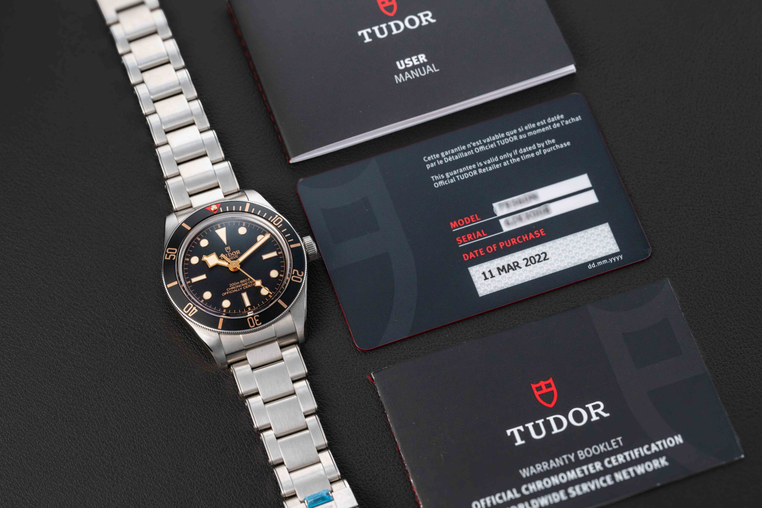 Offered here is a Tudor Submariner-style dive wristwatch, Reference M79030N-0001, nicknamed the “Black Bay 58″, as Tudor’s follow-up to their popular Black Bay.  The “BB58” upgraded from the original model, most noticeably slimming down the size of the watch, now 39mm and with a thinner case thickness.  This Tudor Black Bay 58 comes un-worn complete as a “full set” with its original Tudor box, booklets, and Warranty Card, showing the original date of sale in March of 2022.  This “BB58” is in new condition and still retains the original protective wrap on the case.