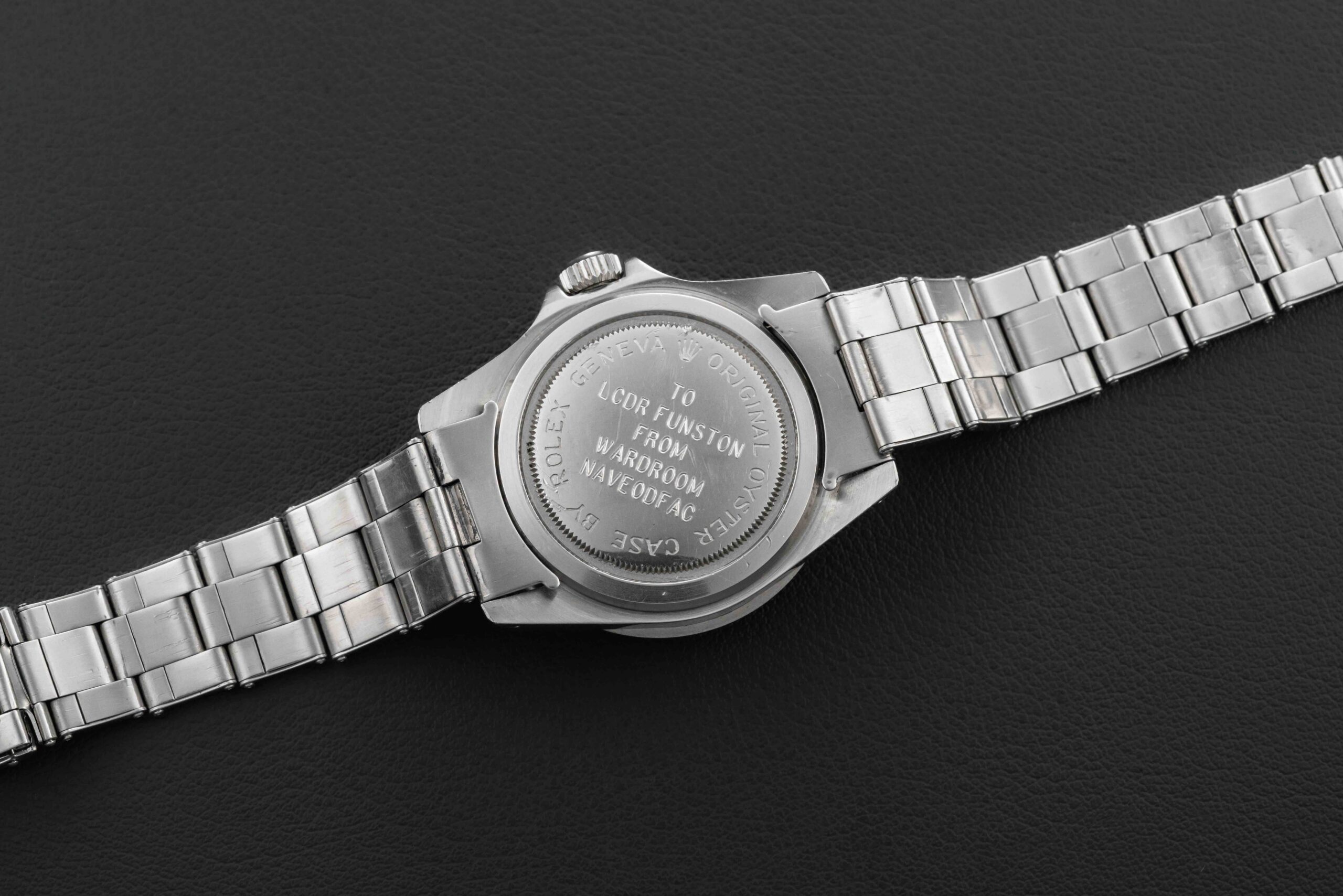 Offered here is a rare and historically important Tudor Submariner, Reference 7016/0, circa 1968. This reference is a direct transition from the reference 7928, which had one year of overlap in 1968 when both references used this same rare “Small Rose” dial variant. However, what makes this example stand out from the rest is the engraving on the outside of the caseback, which reads “TO LCDR FUNSTON. FROM WARDROOM NAVEODFAC.” The NAVEODFAC stands for the Naval Explosive Ordnance Disposal Facility, who were trained and responsible for the rendering safe of all types of ordinances, such as chemical, biological, nuclear, etc. LCDR William Funston was an Executive Naval Officer of the USS William R. Rush during the 1960s, and was given this watch in appreciation of his service by the wardroom (I.e., the naval officers) of the NAVEODFAC division amongst the ship.