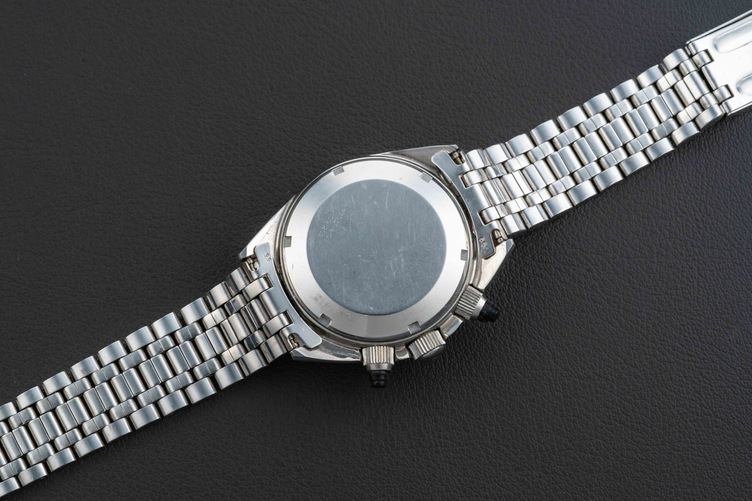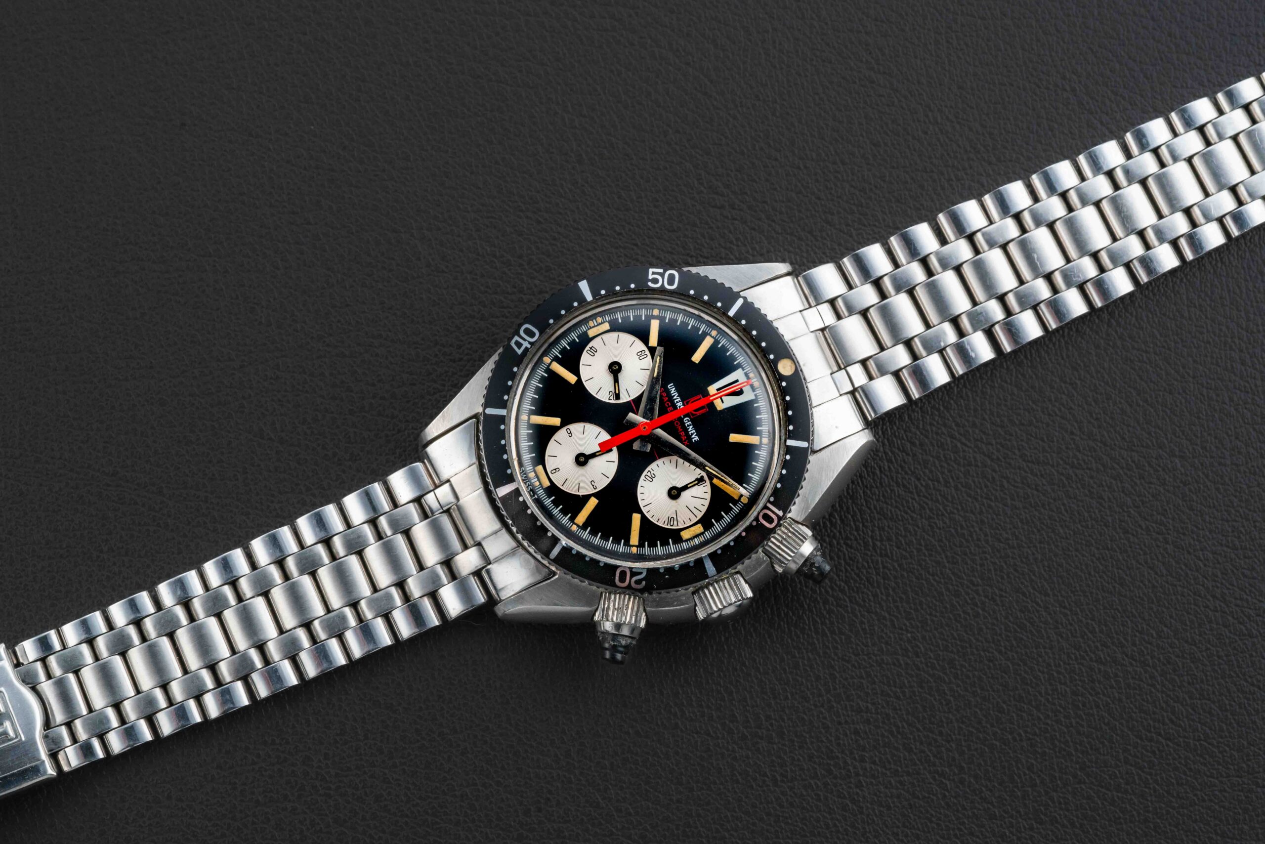 Offered here is one of the nicest examples we’ve ever seen of a first execution (MK1) Universal Geneve Space Compax, reference 884104/01, circa 1966. Powered by the venerable Valjoux 72, the Space Compax was marketed as one of Universal Geneve’s versatile sports chronographs. This Universal Geneve Space Compax is in excellent condition. The case appears unpolished, with thick and even lugs, and the original bevel is in perfect condition. The dial is mint, with no flaws. The original tritium lume is present in both dial and hands, aging to a beautiful golden yellow. The reference and serial number is still visible clearly on the caseback, which have been confirmed by an Extract of the Archives included in the sale.