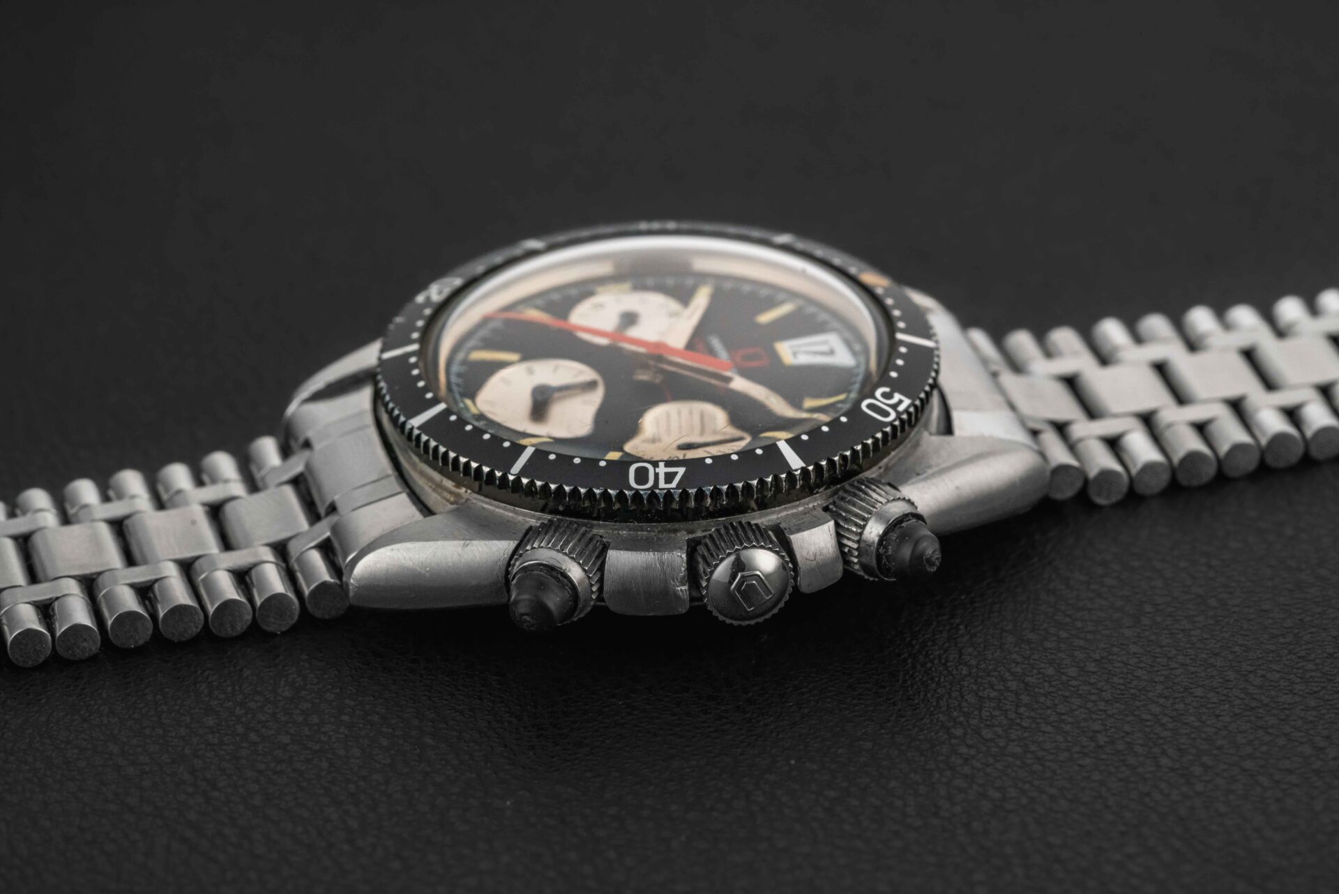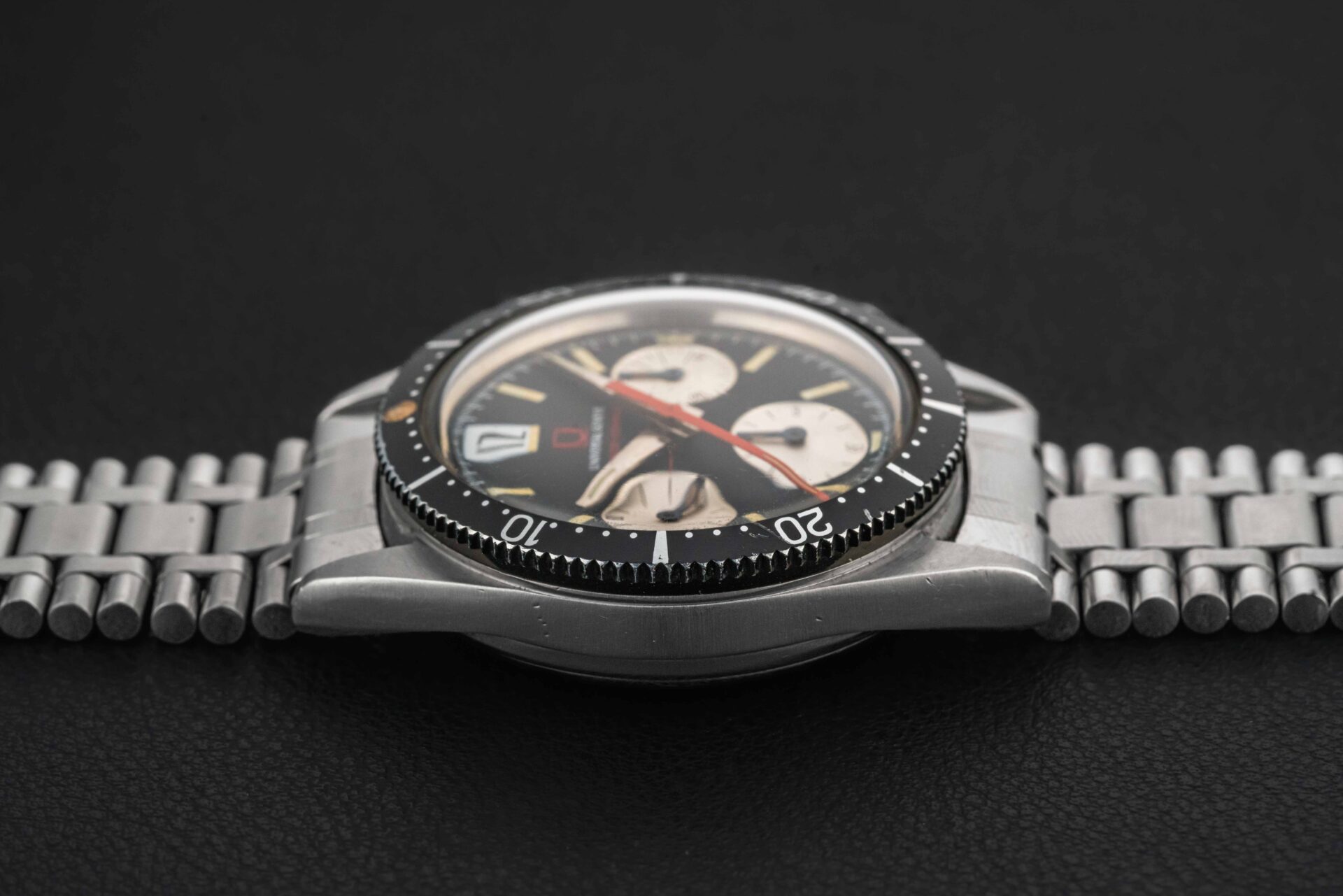 Offered here is a lovely example of a first execution (MK1) Universal Geneve Space Compax, reference 884104/01, circa 1960s. Powered by the venerable Valjoux 72, the Space Compax was marketed as one of Universal Geneve’s versatile sports chronographs. This Universal Geneve Space Compax is in nice vintage condition. The case appears lightly polished, with sharp lines on the case; the reference and serial numbers are no longer visible on the outside of the caseback, as is common on these models due to their light engraving. The dial is mint, with no flaws. The original tritium lume is present in both dial and hands, aging to a beautiful golden yellow color.
