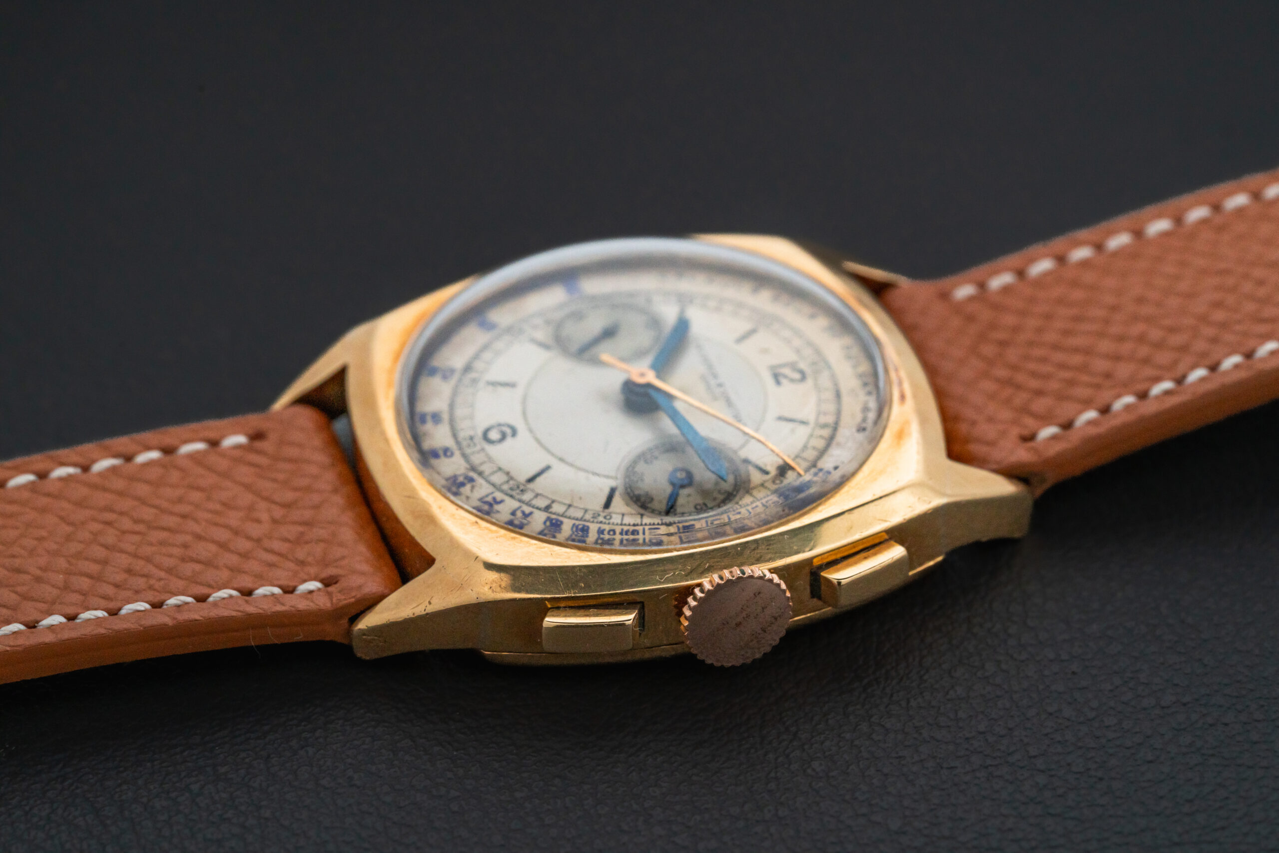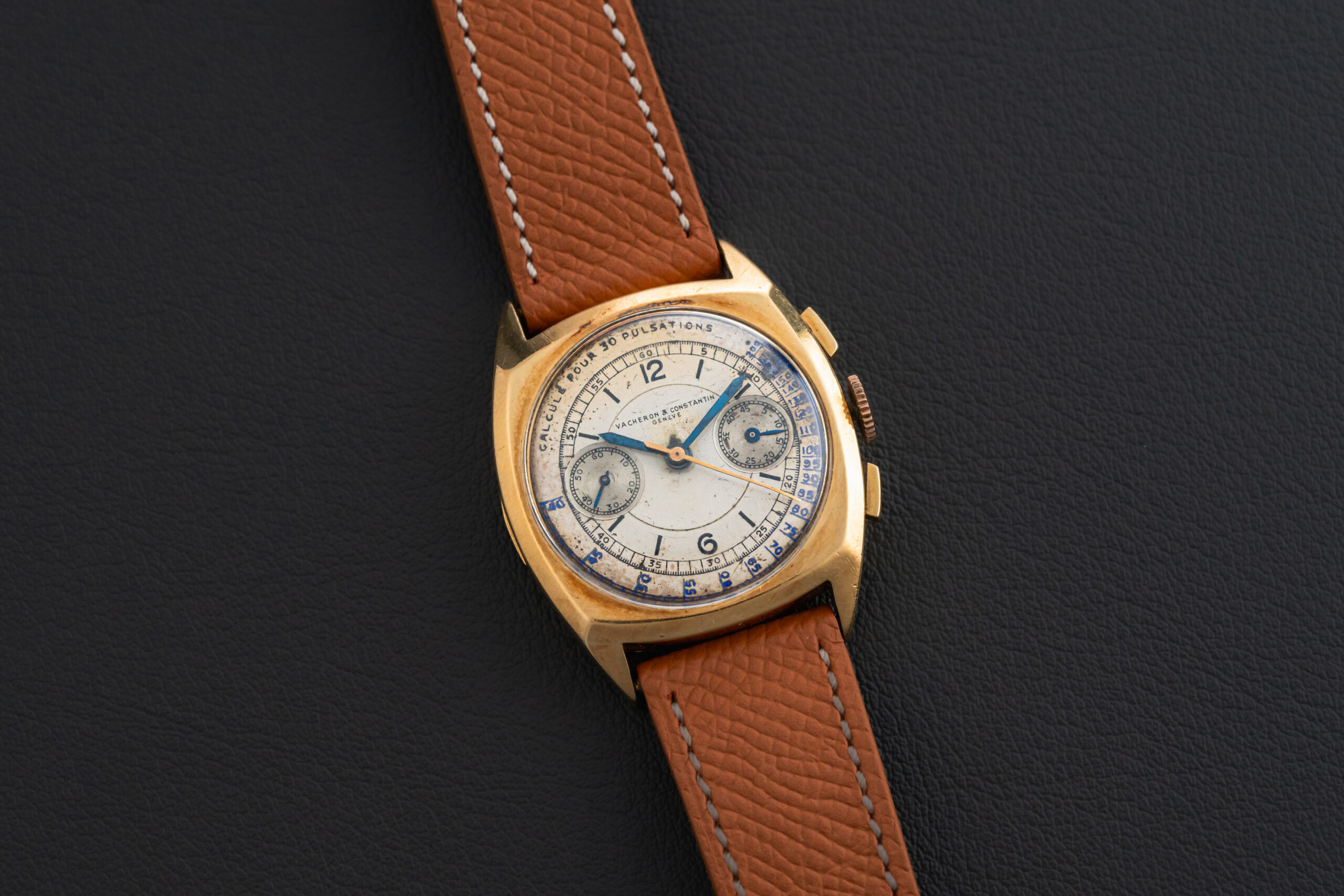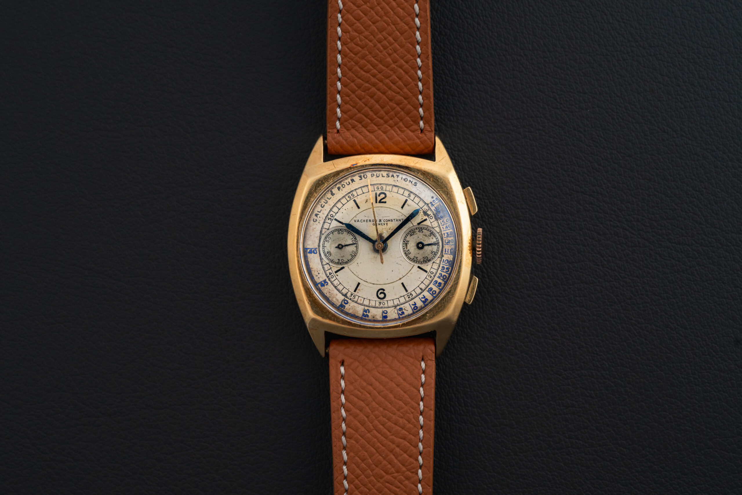 Offered here is certainly one of the rarest watches we have ever had the pleasure to offer for sale – a Vacheron Constantin cushion-shaped chronograph, produced in 1939 in a total of 3 pieces, housed in 18kt yellow gold, and bearing the reference 4111. This historically important Vacheron is the only one of the three produced with a pulsations sector dial, and of the three produced, the last to appear in auction was with a refinished dial in 2007, selling for approximately $170,000, which was a lot of money at the time for a watch! The third example was sold at some point by Davide Parmigiani. This watch comes with a full extract book from Vacheron Constantin.