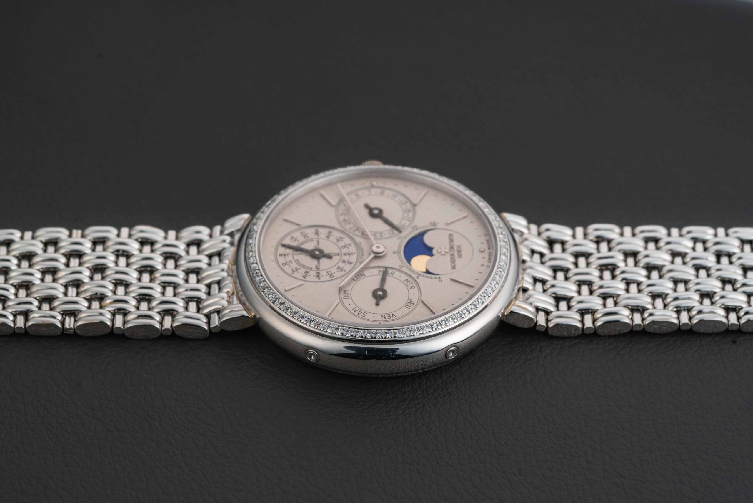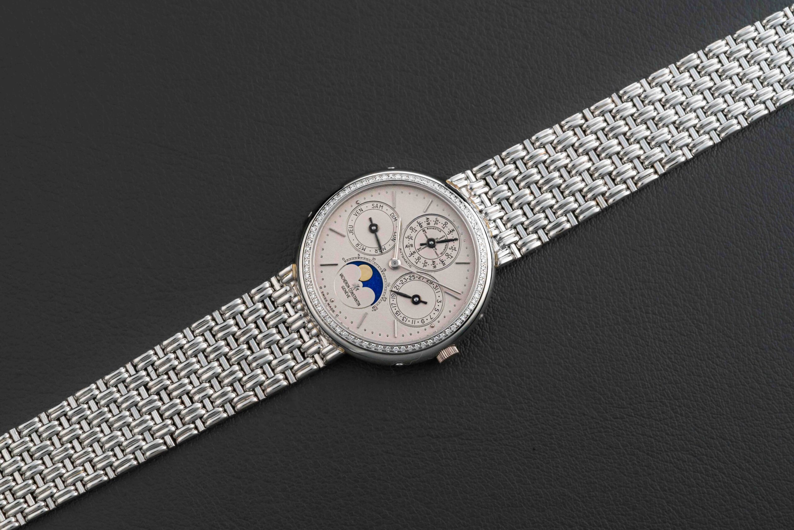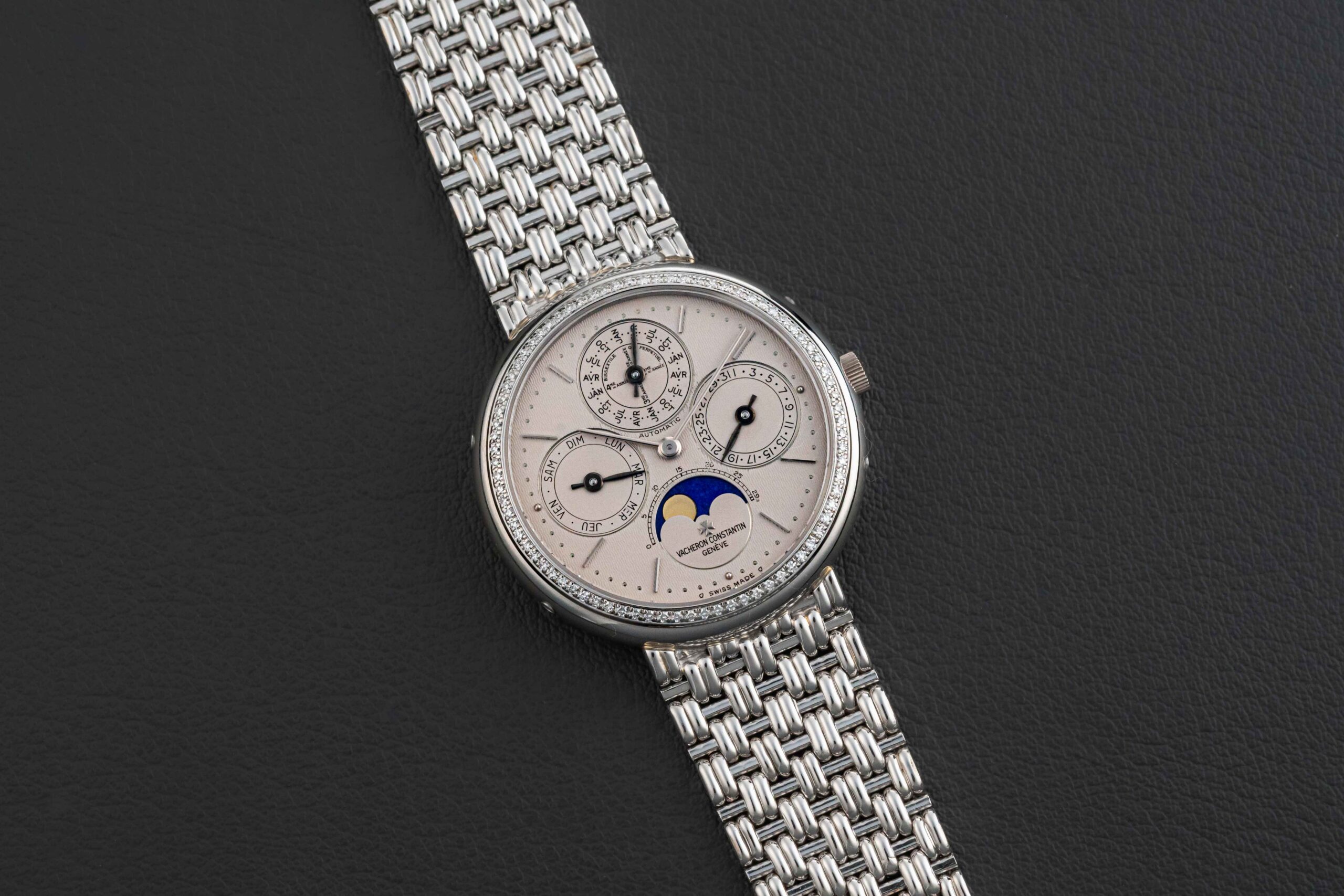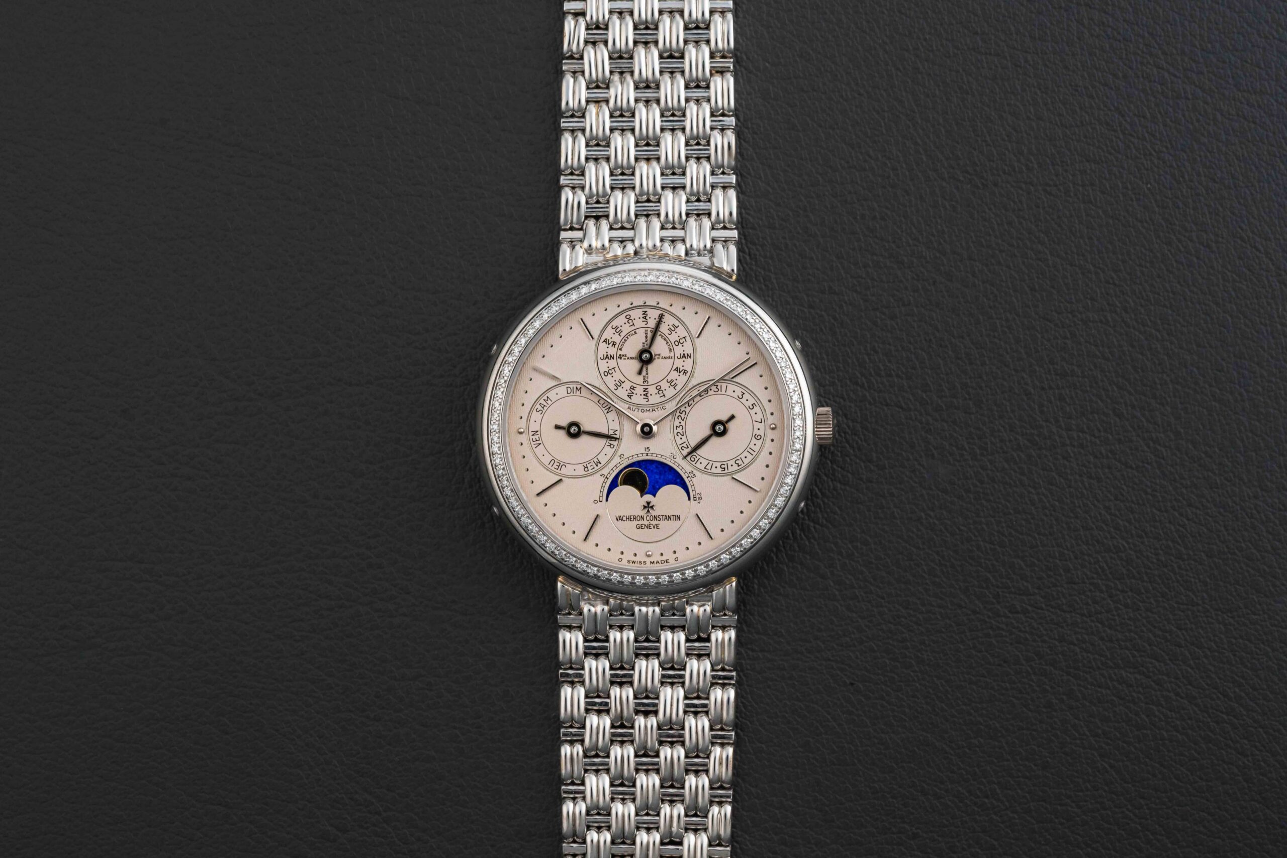 This Vacheron Constantin perpetual calendar is in excellent condition, with a strong case and visible hallmarks. Further, there are no marks or wear to the dial, and a completely uncut/unsized bands.