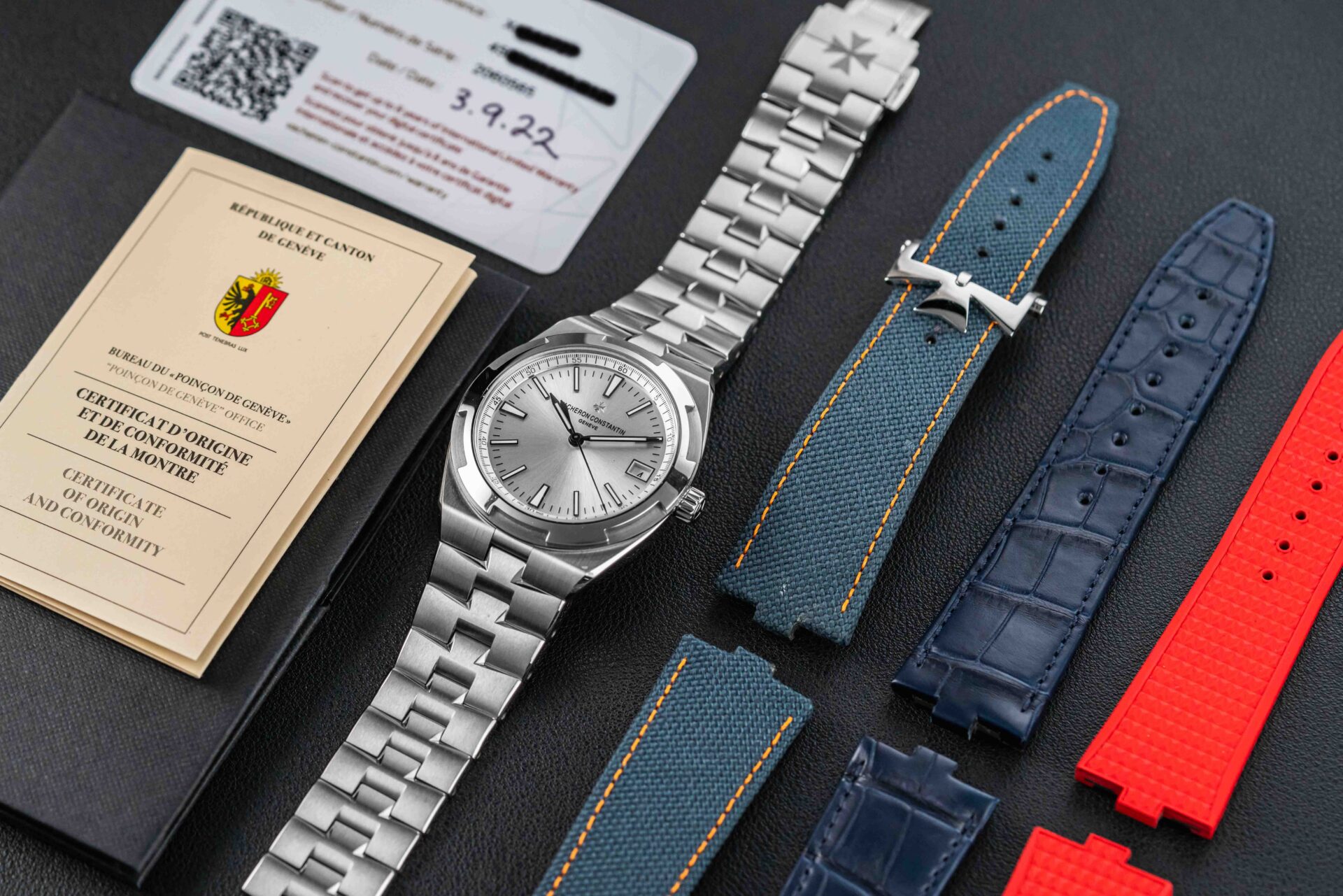 Offered here is a full-set Vacheron Constantin Overseas, reference 4500V, sold in 2022, and fit with a silver dial. This Vacheron Constantin Overseas is in excellent pre-owned condition, only lightly worn by its original owner, and retains its original Vacheron Constantin box, Warranty Card and Certificate, booklet, and both additional bracelets (three in total – leather, rubber and steel).