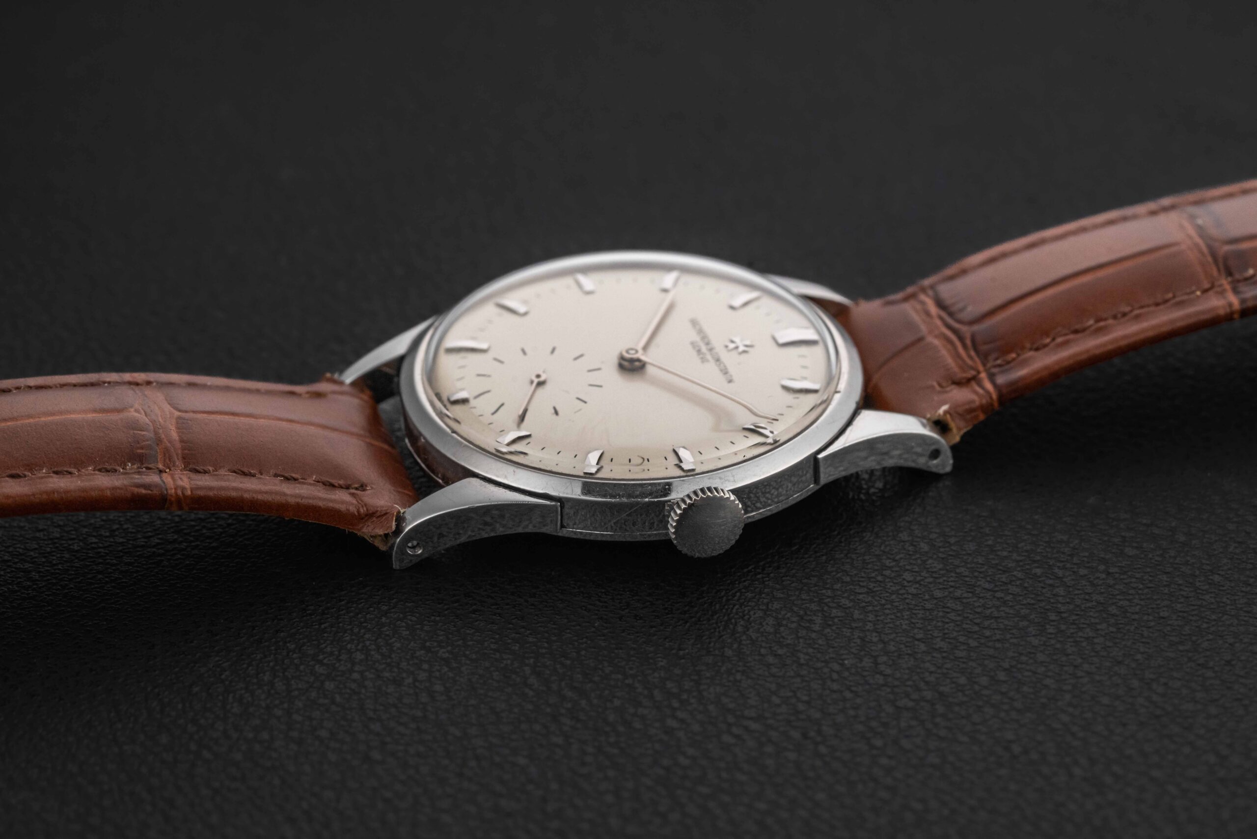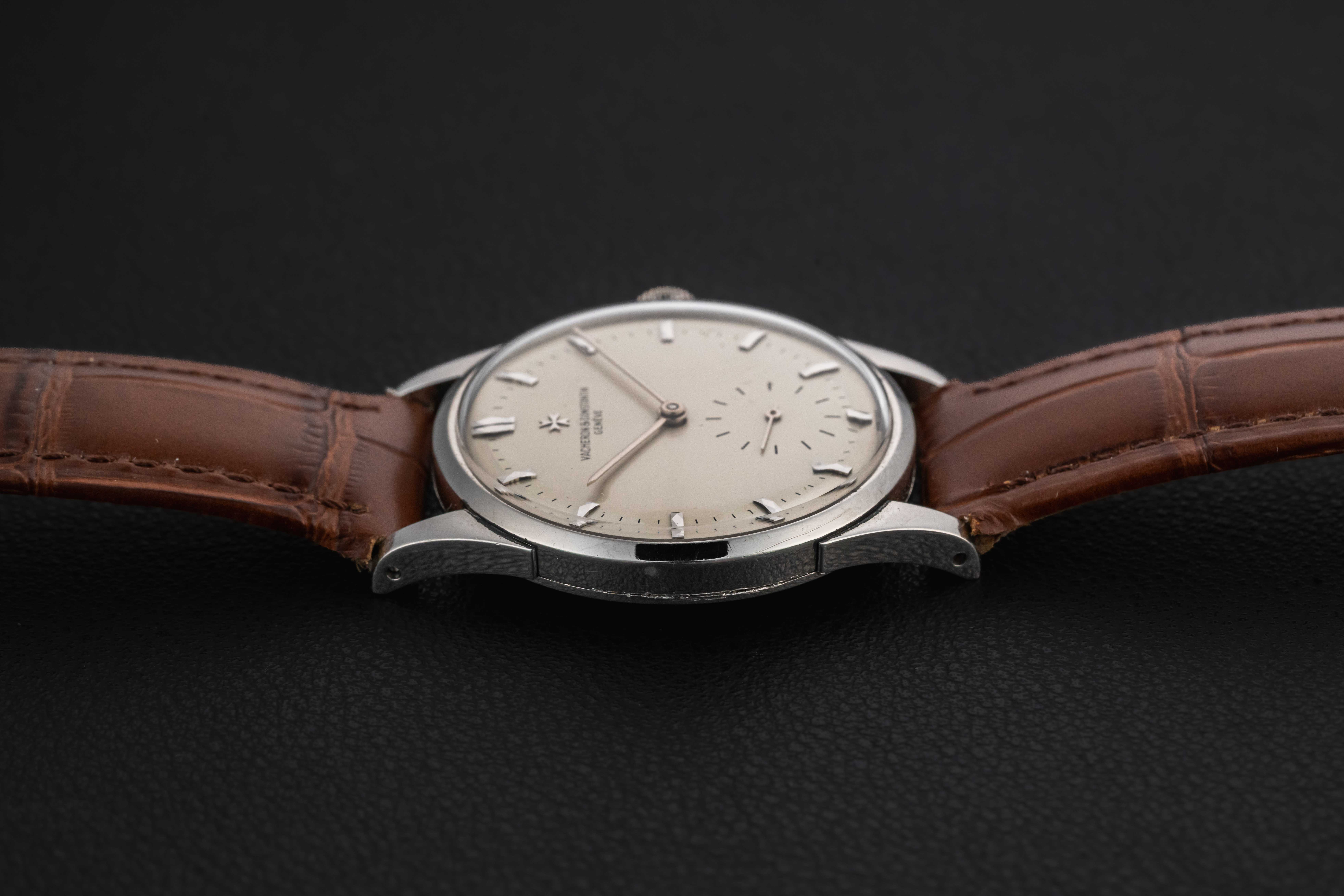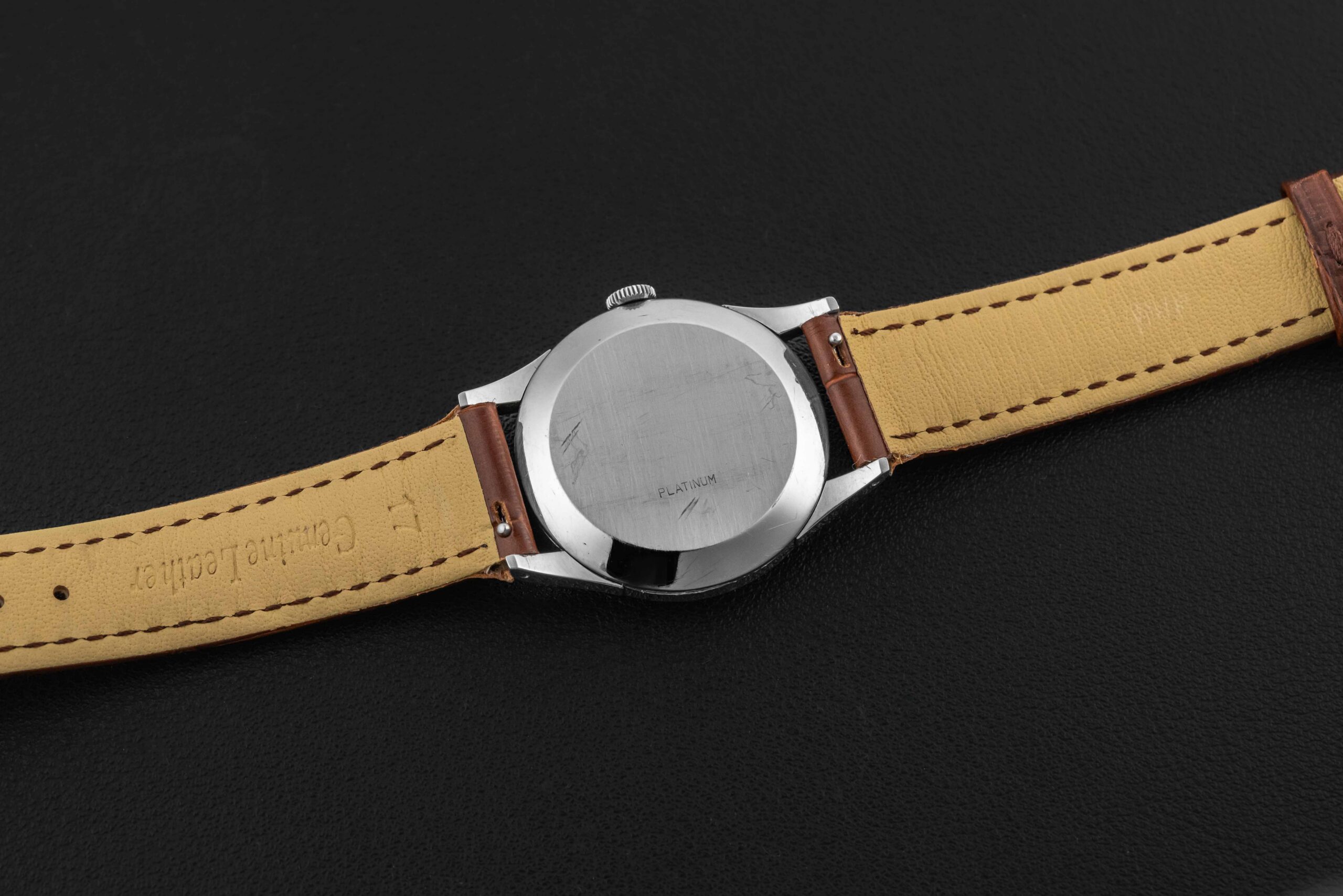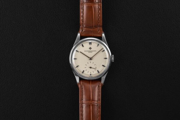 Up for grabs is a very rare bird – a 1950s Vacheron Constantin Calatrava-style watch, reference 4073, housed in platinum. While this reference has been known to the market (and even has a case designed by Antoine Gerlach, who also designed the Patek Philippe 96 and Patek Philippe 570 reference cases), almost none are found in platinum. This rare Vacheron Constantin remains in great vintage condition, with a seemingly unpolished case showing minimal wear, and a lovely dial, show some light tool marks towards the edge of the dial between 3 and 4 o’clock, and some small marks in the register, overall very well-preserved.