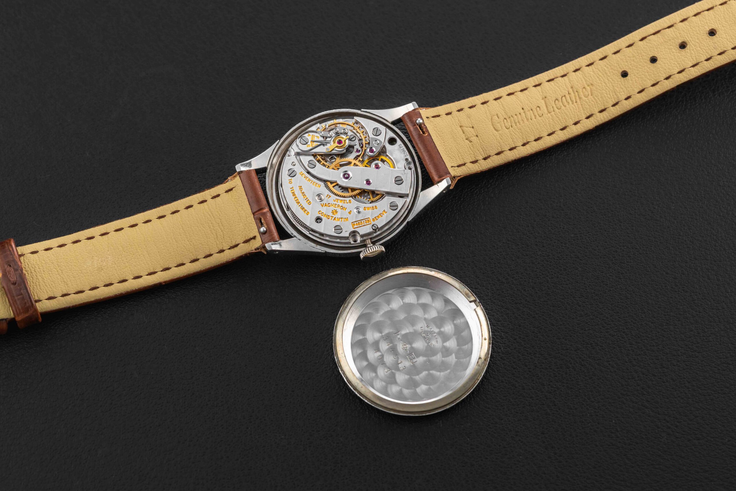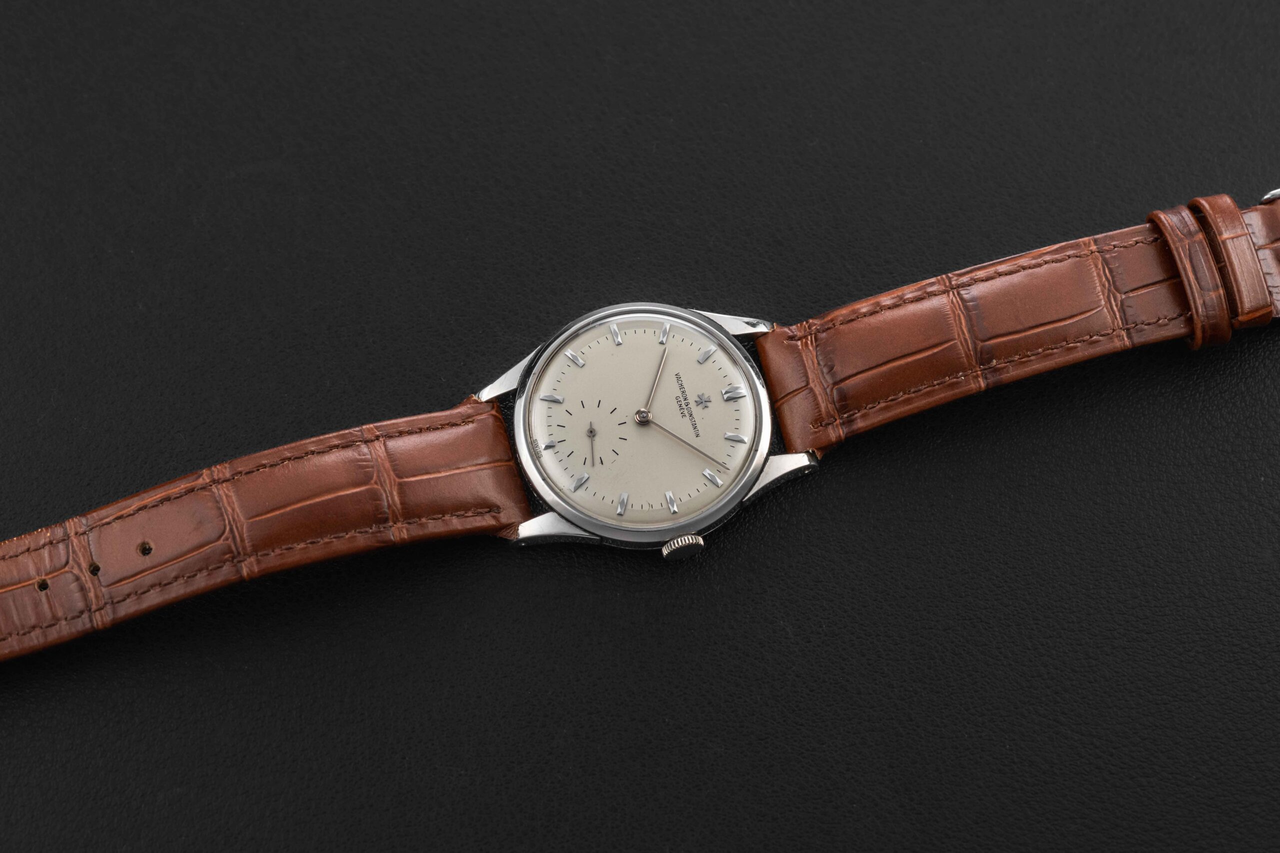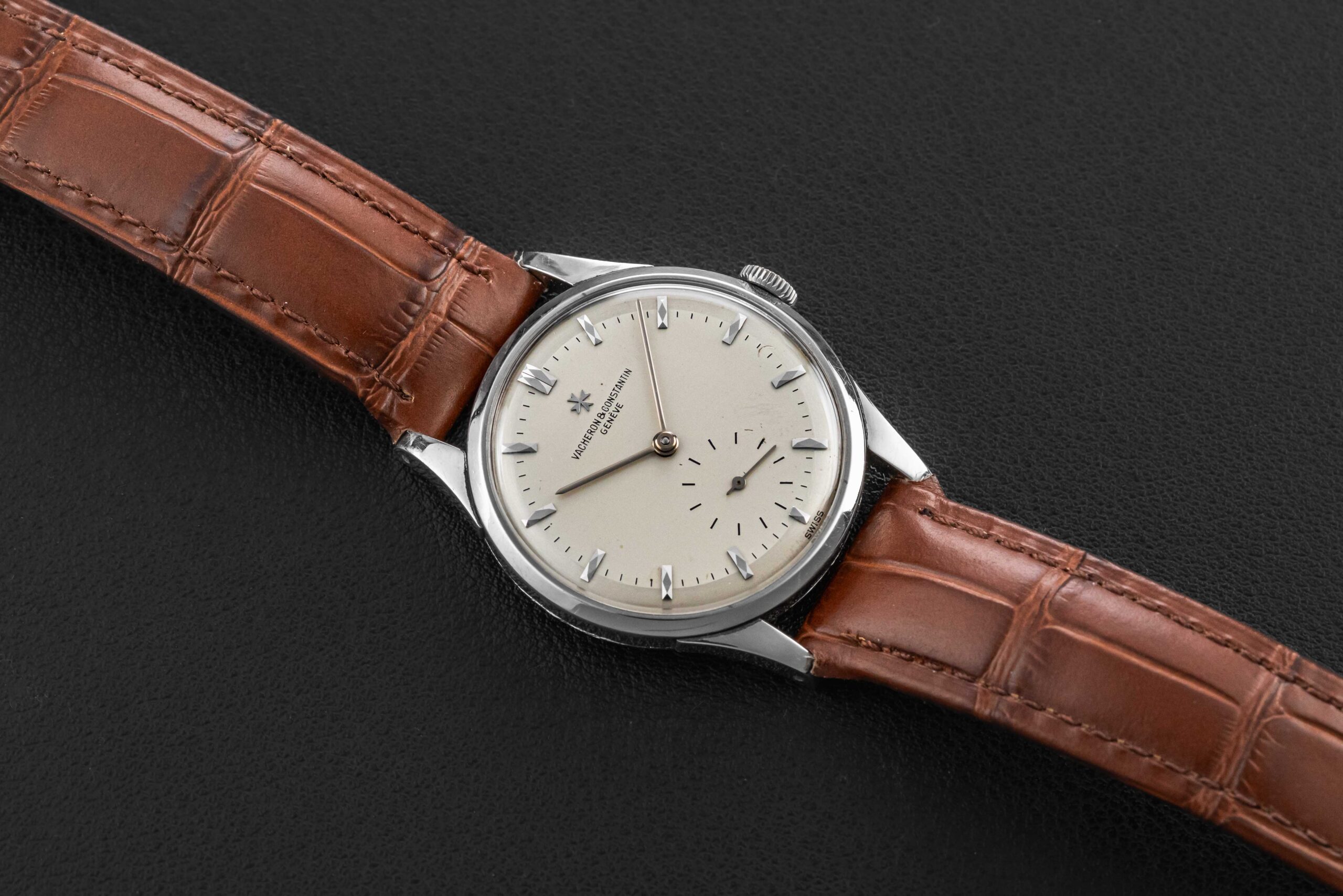 Up for grabs is a very rare bird – a 1950s Vacheron Constantin Calatrava-style watch, reference 4073, housed in platinum. While this reference has been known to the market (and even has a case designed by Antoine Gerlach, who also designed the Patek Philippe 96 and Patek Philippe 570 reference cases), almost none are found in platinum. This rare Vacheron Constantin remains in great vintage condition, with a seemingly unpolished case showing minimal wear, and a lovely dial, show some light tool marks towards the edge of the dial between 3 and 4 o’clock, and some small marks in the register, overall very well-preserved.