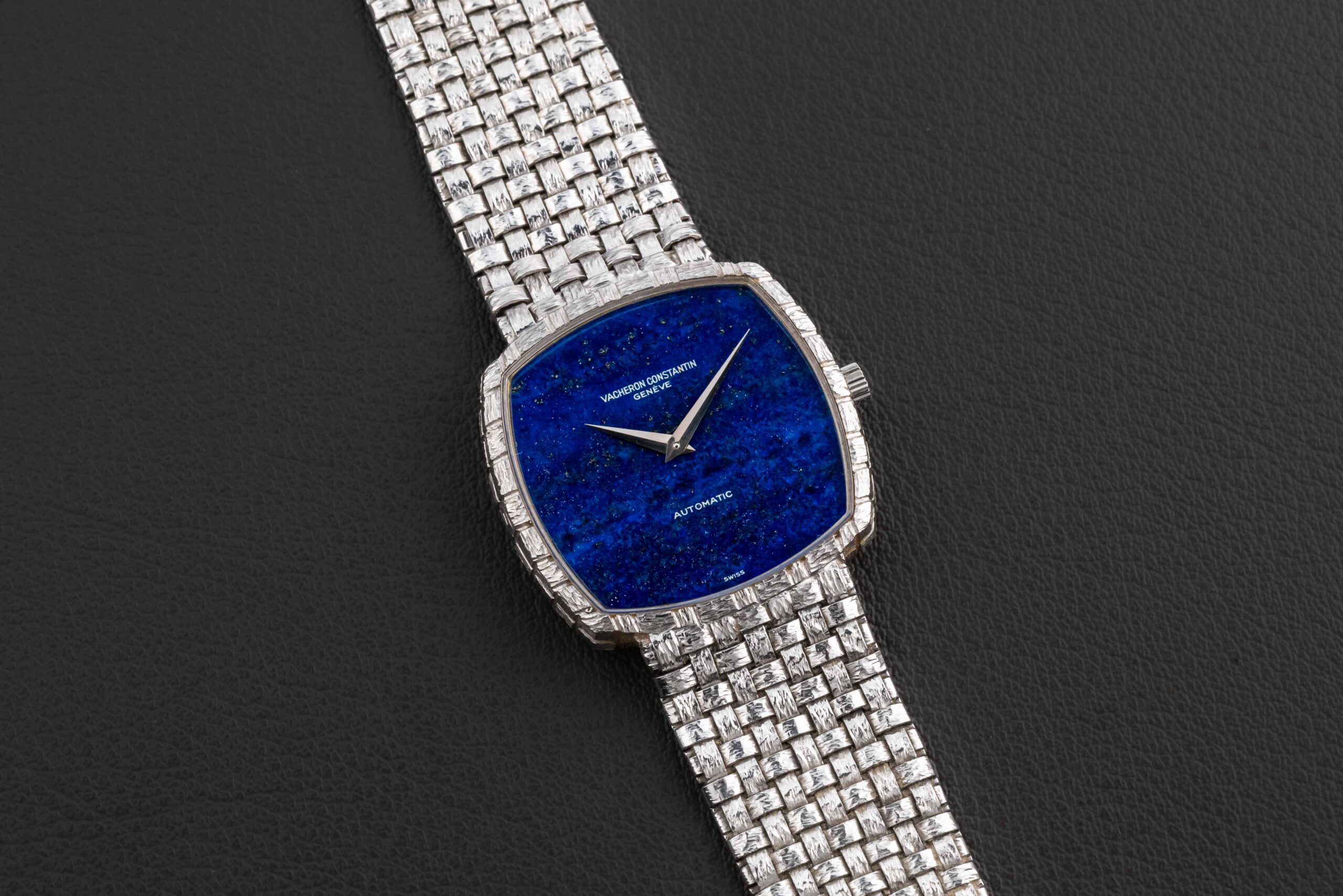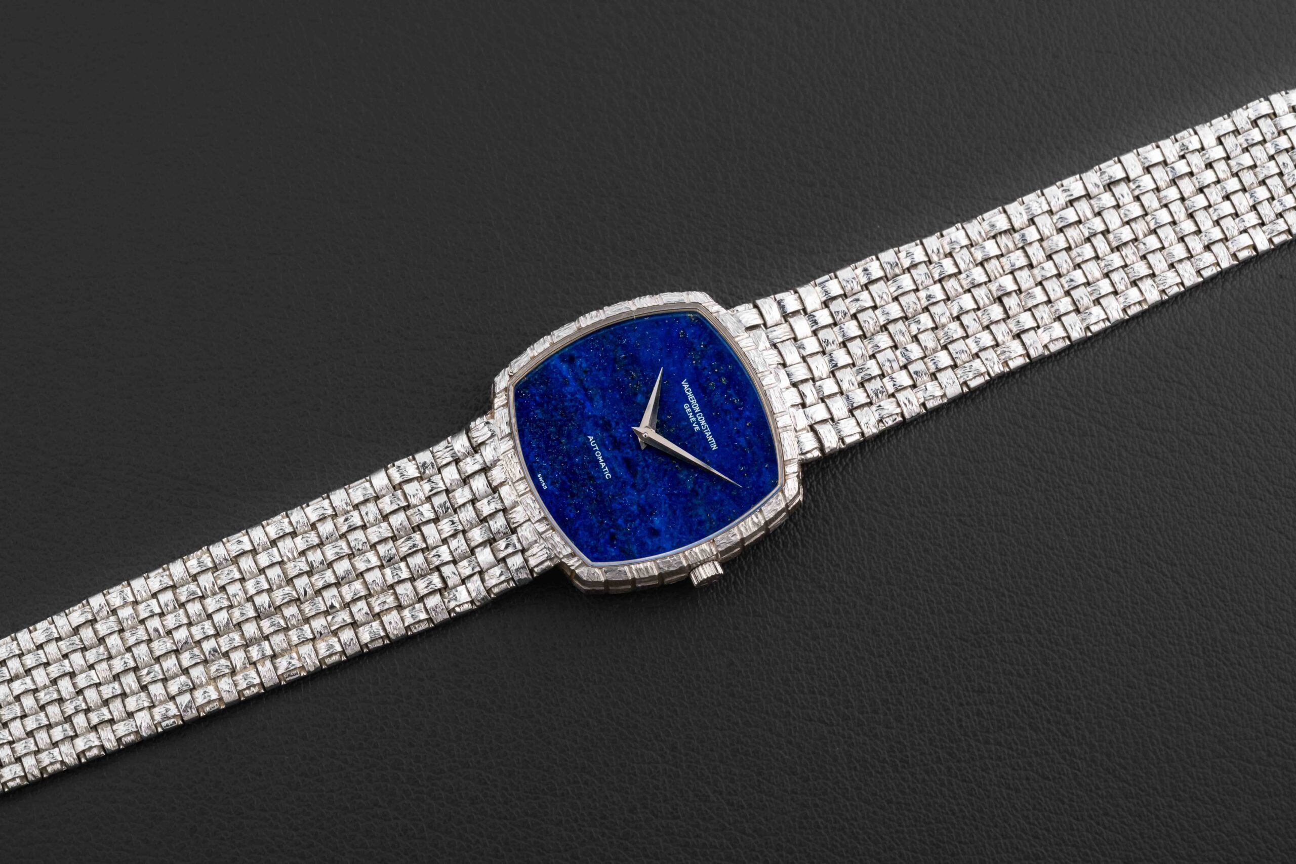 Offered here is a quirky and cool 1970s Vacheron Constantin watch, given the reference 7391, and housed in 18kt white gold. This dressy integrated-bracelet watch is fit with a factory stone Lapis Lazuli dial; the bracelet was produced with a very interesting woven finish. This style of watch has come back into the minds of collectors new and old, especially for those daring to be a little different! The condition of this Vacheron is excellent, showing minimal wear and no cracks or damage to the stone dial; the bracelet does not appear to have ever been sized.